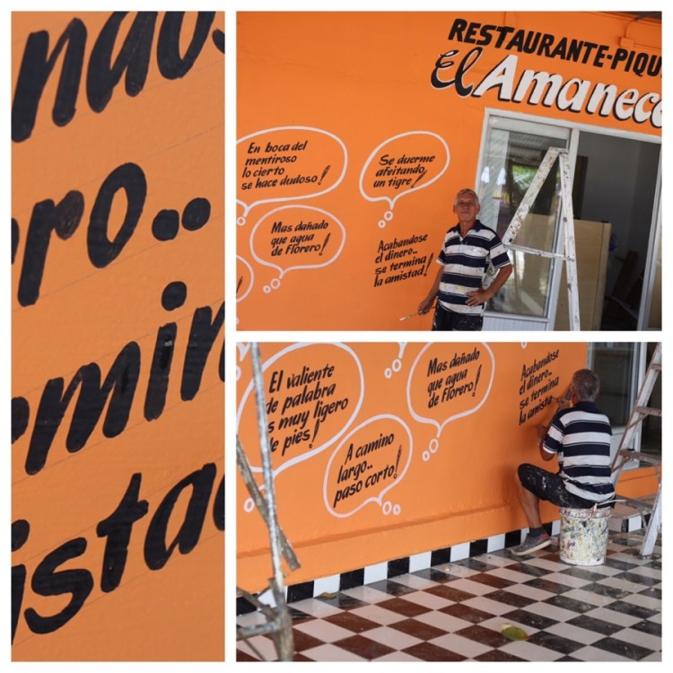 Ein Schriftenmaler ziert gerade die Wand eines neuen Restaurantes. Faszinierend, wie er nur mit zwei Hilfslinien die Buchstaben so gleichmäßig malt. Für die ganze Wand braucht er zwei bis drei Tage und er entwickelt auch das Design selbst. Ich frage ihn, ob er die kleinen oder großen Schriften lieber mag, weil ich glaube, die großen sind schwieriger. Aber er liebt die großen! Die kleinen mag er gar nicht gern.