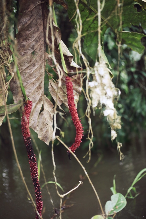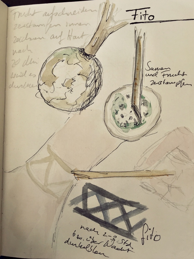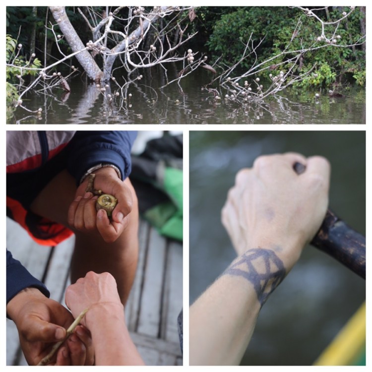 Eine unserer lieben Indioköchinnen ist am ganzen Körper wie mit dunkelblauer Farbe eingefärbt. Sie reinigen Körper und Seele damit. Der Farbstoff kommt von einer Frucht. Die Kugeln werden aufgeschnitten, der Inhalt mit den Samen zerstampft und auf die Haut gemalt. Wer mag, bekommt ein Tattoo, erst unsichtbar, aber nach ein paar Stunden ist es ganz dunkelblau. Ich hoffe mal es ist nicht für immer… nein, es hält wirklich nur ungefähr zwei Wochen.
