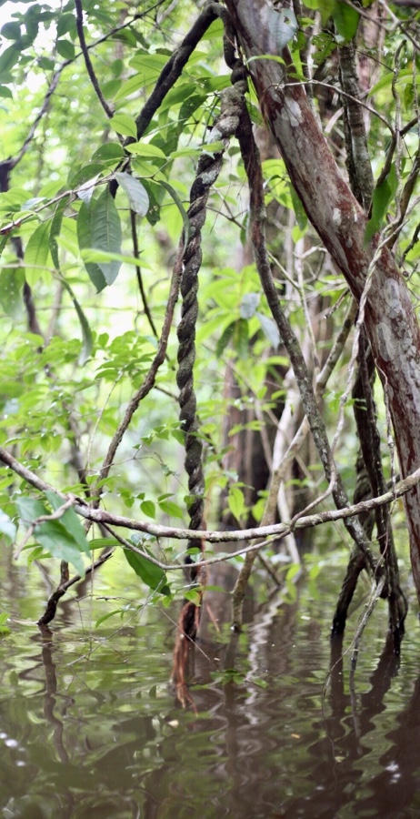 In der Trockenzeit ist Zacambu an einer breiten Sandbank gelegen und hinter dem Haus ist ein See. Jetzt ist einfach alles unter Wasser. Ein schöner Ort als Basis, aber auch schon die Hinfahrt war interessant und im Baum erspähten wir schon das erste Faultier. Mein Tipp: Fernglas mitnehmen! Ich war so froh um meines, weil damit oft die kleinen schwarzen Punkte, die man am Foto sieht, plötzlich Fell und Struktur bekommen und voll schön zu beobachten sind.