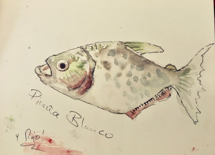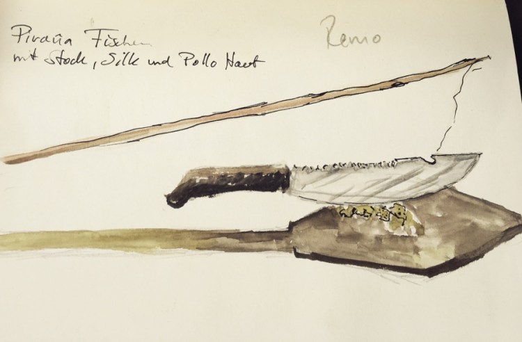 Pirañas Fischen steht am zweiten Tag auf dem Programm. Gefischt wird mit einer Holzrute, Silk und Hühnerhaut. Das Fett zieht die Fische an. Ich nutze aber die Zeit, um ein wenig im ruhig stehenden Boot zu fotografieren und zeichnen.