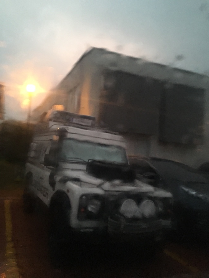 Es regnet… wir verabschieden uns vom Defender und Laura hatte natürlich recht, unser Flug wurde gecancelt.