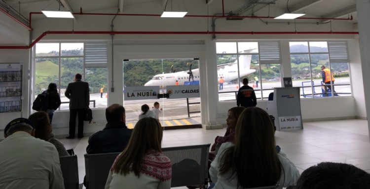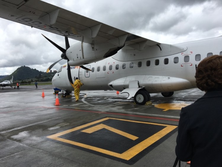 Irgendwann geht es wirklich weiter und wir dürfen in die kleine Abflughalle, mit Aussicht auf ein landendes Flugzeug. Voll klein ist unsere Maschine nach Bogota mit nur 4 Plätzen pro Reihe. Das erklärt auch, warum hier nur ein Minihandgepäck erlaubt ist.
