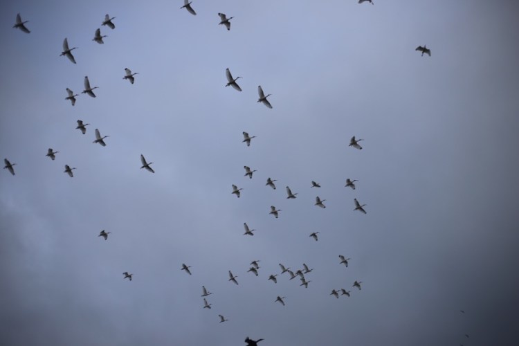 Eine Schar weißer …. mit langem gebogenen Schnabel ziehen ganz knapp übers Wasser bevor sie wie alle anderen den ersten Baum ansteuern, der ist natürlich total überbelegt.