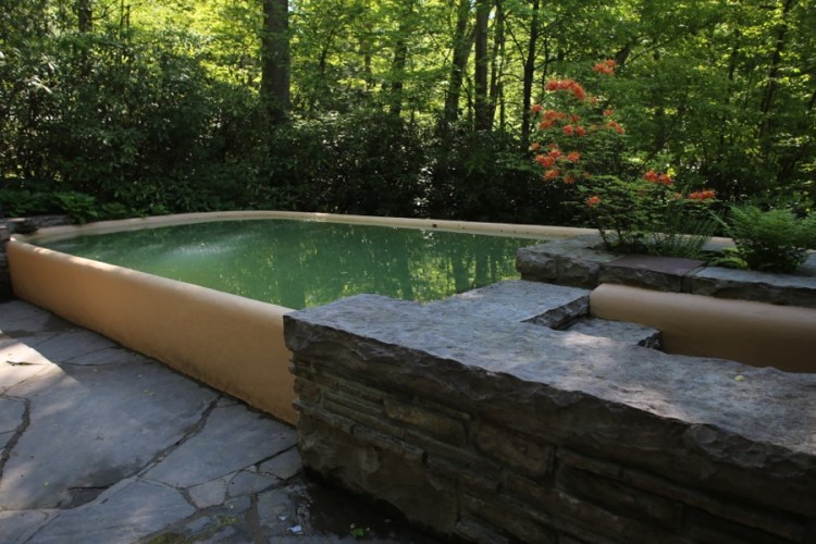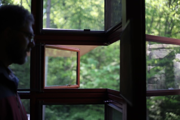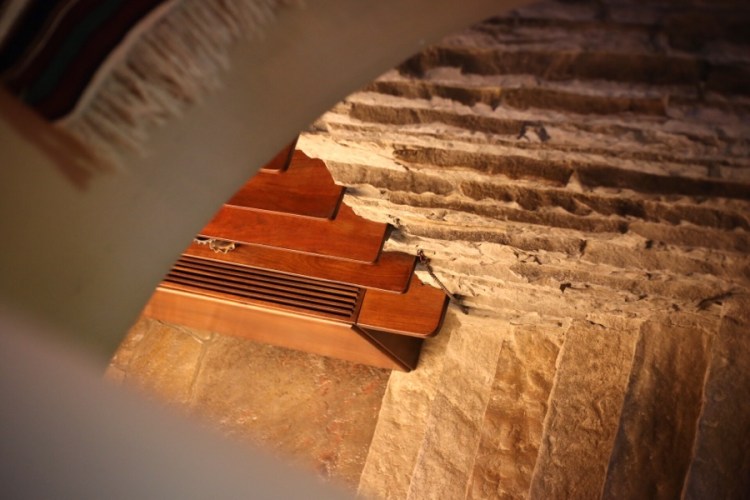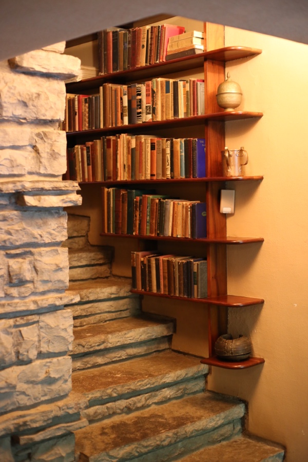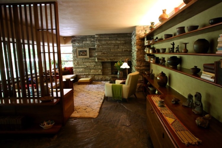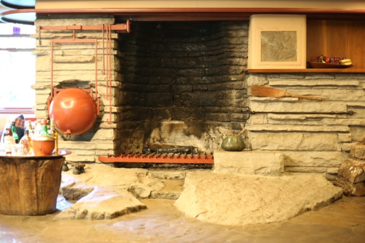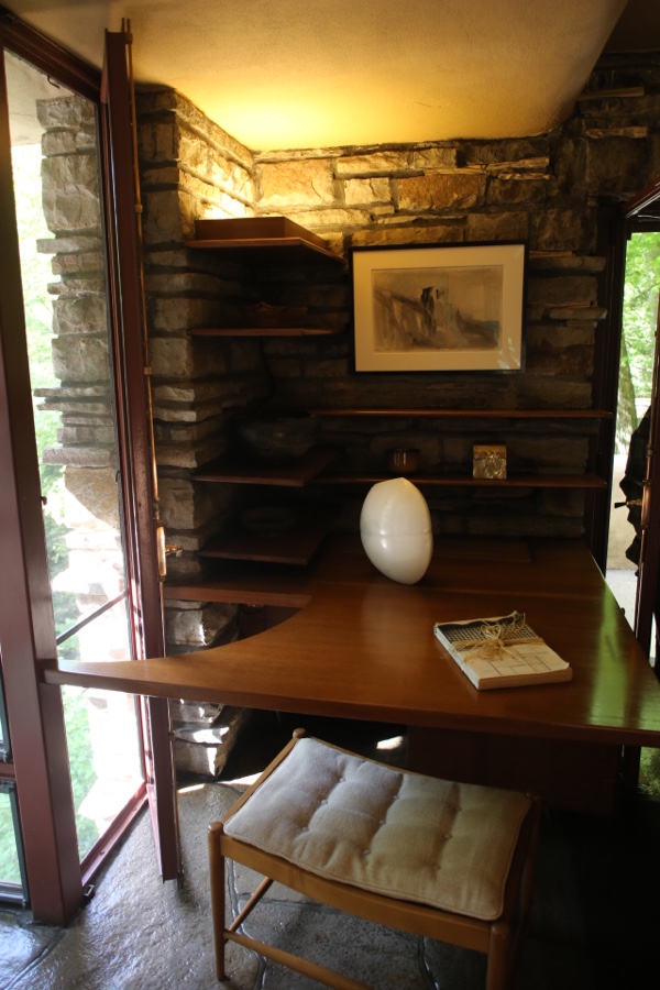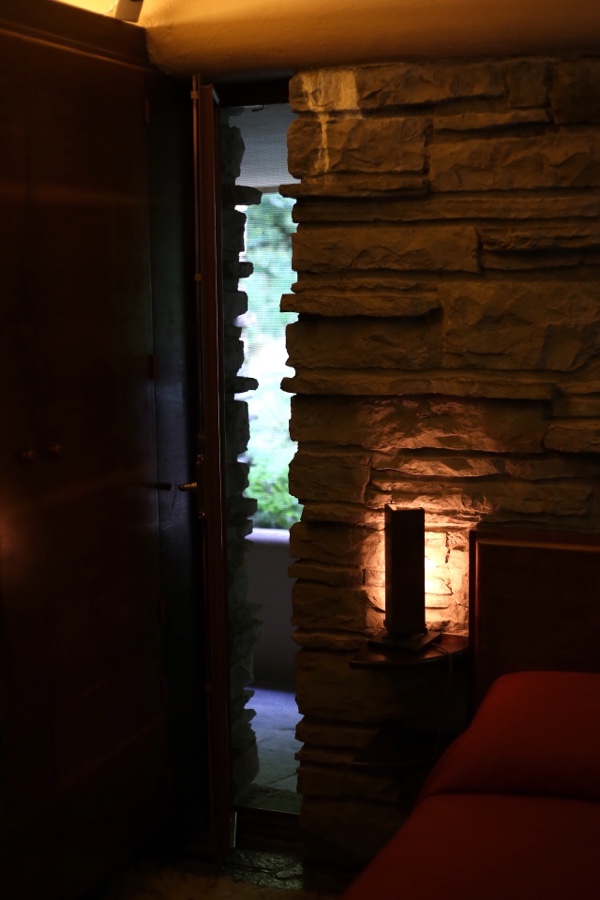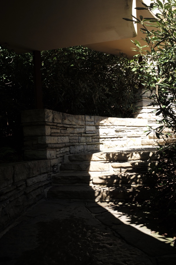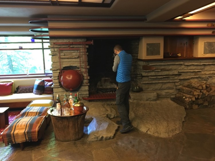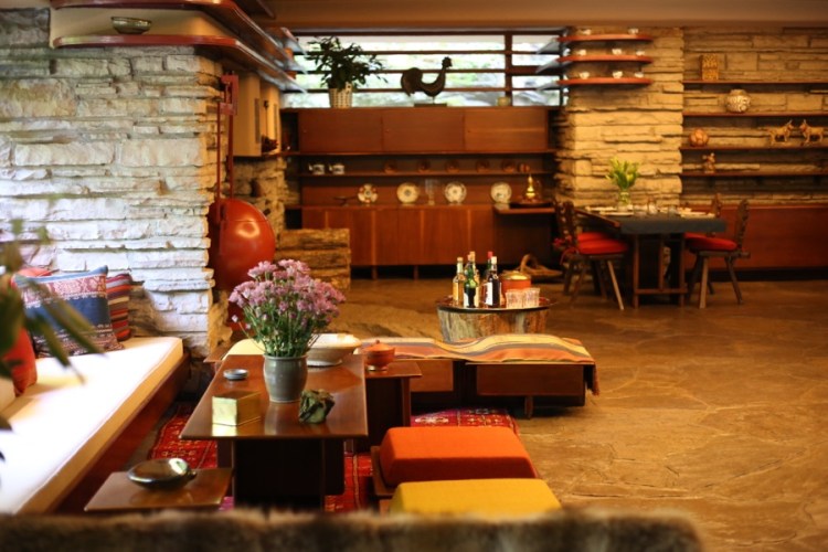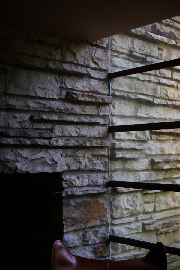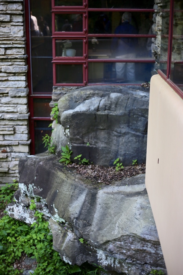 Wright positionierte das Haus nicht mit Blick zum dem kaskadenartigen Wasserfall – wie es vermutlich die meisten Architekten machen würden und was die Familie sicher erwartet hatte – sondern direkt auf einen der Felsen. So verbindet sich Wasserfall und Haus zu einer einzigartigen Einheit. Der Felsen ragt im Haus sogar vor dem Kamin noch heraus.