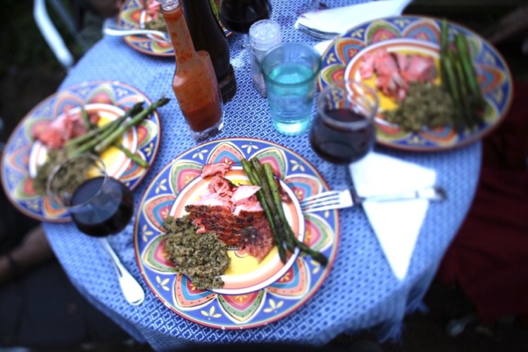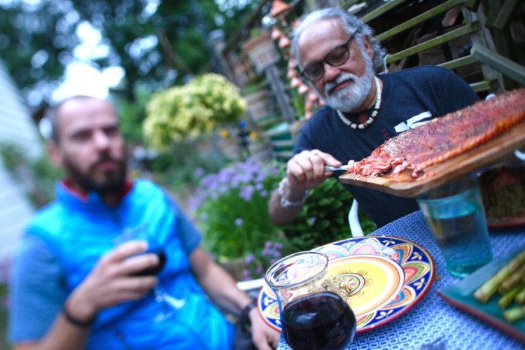 Wir reißen uns los. Robert wartet mit dem Essen. Ihr könnt euch gar nicht vorstellen, wie lecker es im Haus bei Robert und Elena oft riecht, denn Elenas Quiche ist legendär, Robert smoked mal Fisch (heute Lachs) mal Huhn… jedesmal ein Festschmaus!