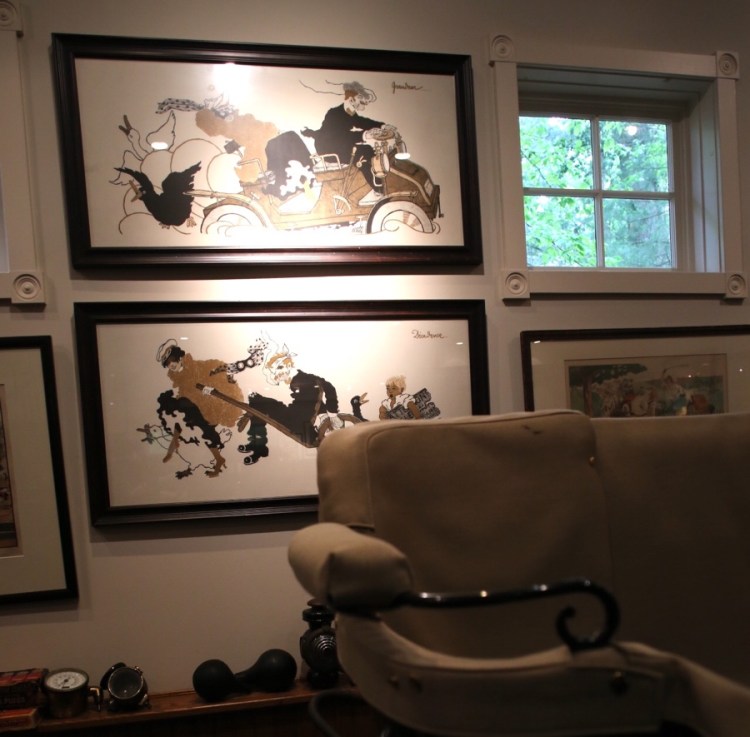 Auch die vielen Karrikaturen zum Thema Automobil und alles andere Gesammelte aus der Zeit dieser Autodinosaurier ist beeindruckend. Das ganze Haus ist ein Gesamtkunstwerk, es sind nicht nur alte Autos in einer Garage. Wir machen den Mund gar nimmer zu, Martin hat ein Leuchten in den Augen und Elena erzählt, bei welchen Touren in Europa sie dabei war.