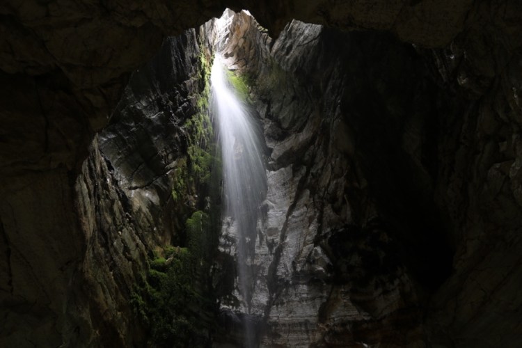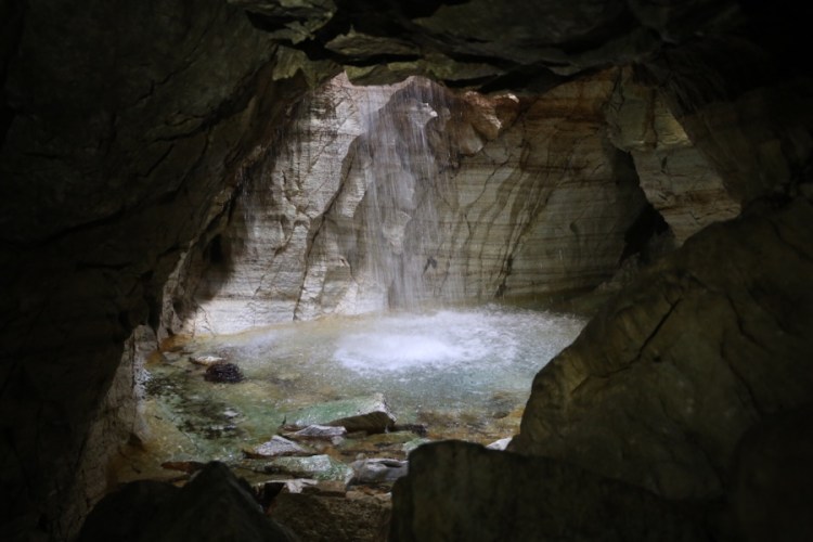 Die dritte muss man suchen und ist noch viel enger und unheimlicher. Millionen Wassertropfen glitzern in meinem Stirnlampenlicht an der Marmordecke. Da würd ich gern weiterrobben, aber eine zu große Stufe kommt sehr bald. Allein ist es mir zu gefährlich und glitschig hier runterzugehen. Wenn ich nicht mehr hochkomme… richtig blöd… Martin ist nämlich nicht dabei. Also bleibt es mein Geheimnis, ich bin weit und breit die einzige, die die dritte Höhle gesucht und gefunden hat. Und das Bild der Millionen Tropfen nehm ich im Kopf mit.
