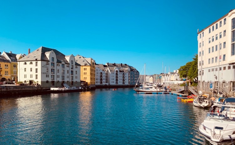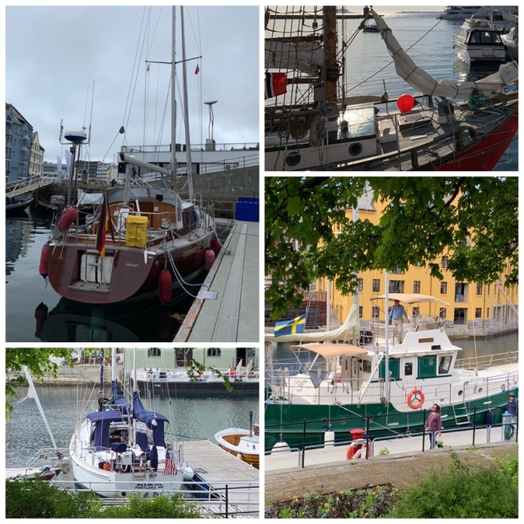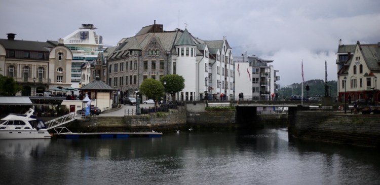 Ålesund, die Jugenstilstadt. Interessant, weil sie um 1904 abgebrannt ist und unter anderem mit Hilfe von einigen deutschen Baumeistern wieder aufgebaut wurde… nur hald so, wie man damals gerade baute: im Jugendstil. Im Vergleich zu anderen Städten deshalb einzigartig. Ab und zu lugt das viel zu große Kreuzfahrtschiff durch die Häuser und Martin lugt dafür im Hafen in die Segelboote. Posten sollten wir auch mal wieder, nach wie vor bevorzugt mit Wlan.