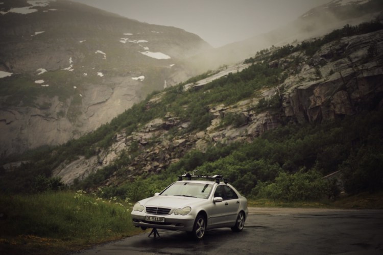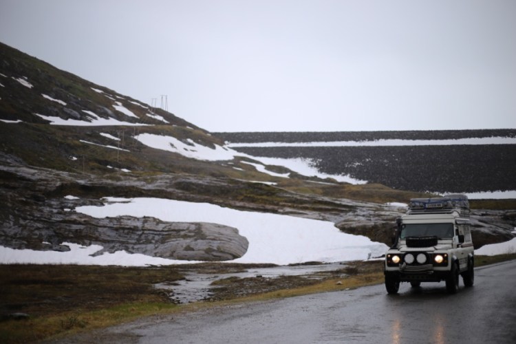 Da – juhuu ein Abstecher! Auf der Karte geht ein kleiner Weg weg zu einem Stausee. Das is immer gut! Aber erstmal müssen wir die Einfahrt finden und von einem Auto vorbei, das definitiv in den Vorpann eines Norwegenkrimis gehört! So beginnen gruselige Geschichten. Oder so enden sie.