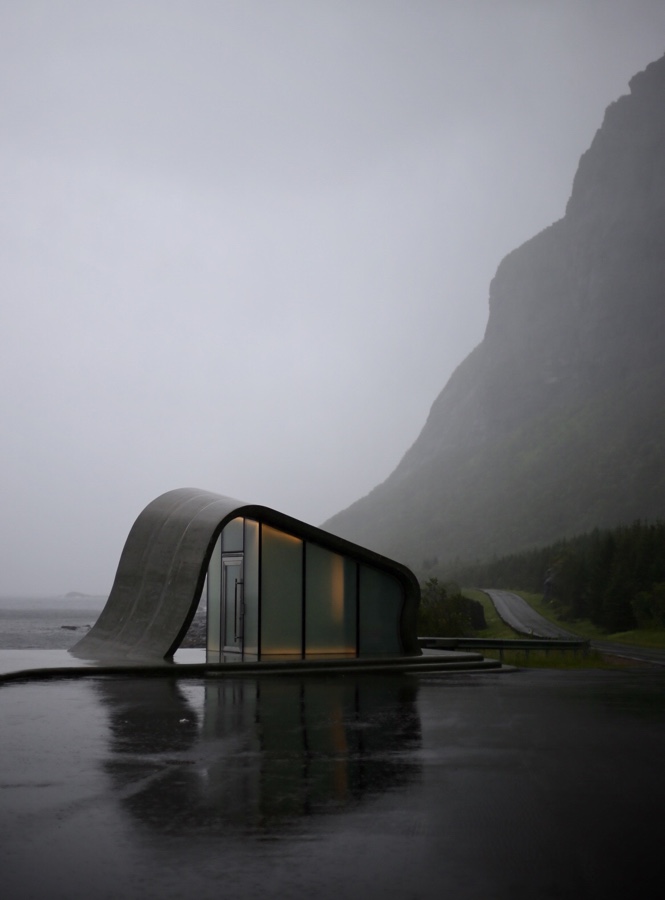 Die E17 ist nicht nur wegen dieser Abstecher und der vielen Fähren abwechslungsreich. Bei den WC-Häuschen übertrifft das norwegische Design echt alles bisher Gesehene.