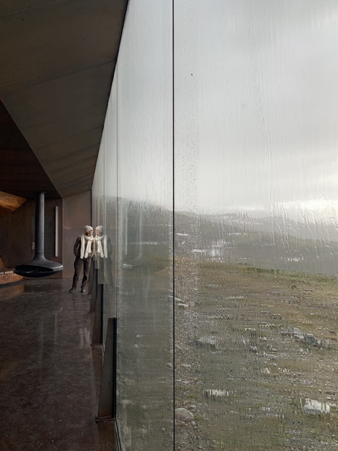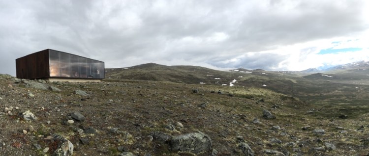 Beim Dovrefjell gibt’s wohl eine architektonisch sehr interessante Hütte zum Beobachten von Moschusochsen. Mit einem Designpreis ausgezeichnet. Das Foto in einer Zeitschrift war zu verlockend… und sie liegt auf dem Weg nach Røros. Naja nicht direkt auf dem Weg, aber das ist uns egal, weil es so gut wie keinen Weg mehr gibt.