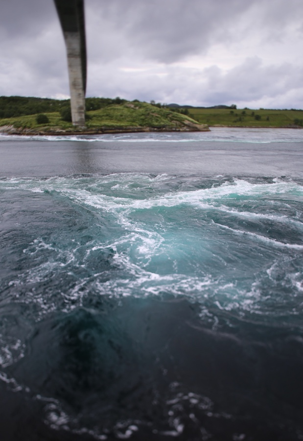 Der Saltstraumen sieht aus wie ein Fluss, ist aber keiner. Es ist ein Naturphänomen: einer der stärksten Gezeitenströmungen der Welt. Das Wasser zwängt sich hier bei Ebbe und Flut durch eine 150 Meter breite Enge und erreicht dabei 20 Knoten. Mal in die eine Richtung, mal in die andere, alle 6 Stunden im Wechsel. Die Farbe vom Wasser und die aufsteigenden Strudel am Rand… schon irgendwie cool!