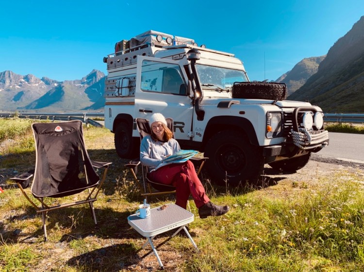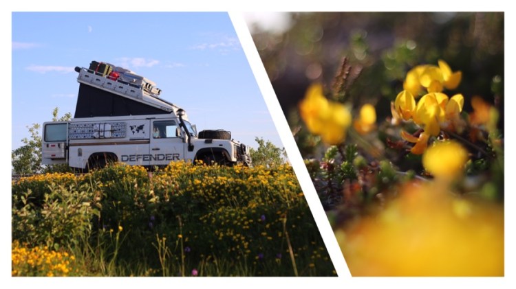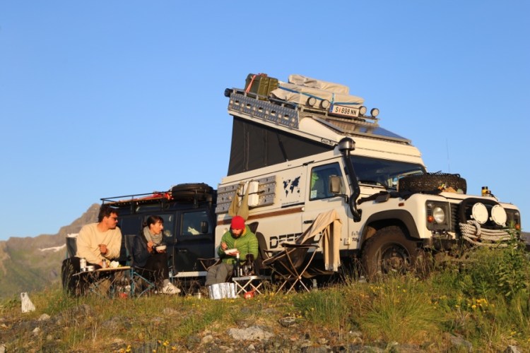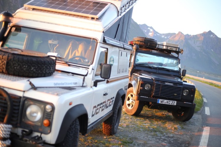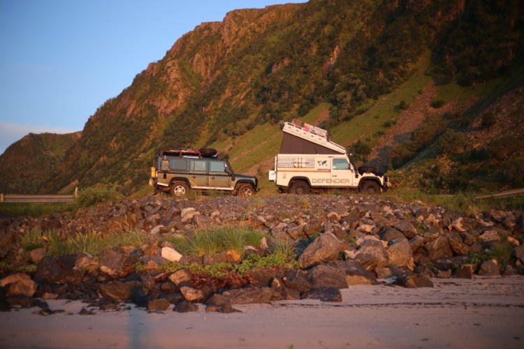 Wenn die Sonne hinterm Berg ist, wird es kalt. Also gehen wir spazieren Richtung Sonne. In der Zwischenzeit ergibt sich eine Defenderfreundschaft! Ein deutsches Auto, aber ein slowenisch/französisches Paar und ein Grund für einen Ausbau/Reisetalk. Wenn man dann lang genug zusammensitzt, sitzt man auch wieder im warmen goldenen Schein. Diesmal begrüßen wir zu viert die Mitternachtssonne und essen gemeinsam.