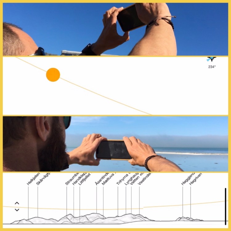 Mit einer App die eigentlich die Bergnamen anzeigt, können wir auch den Sonnenverlauf bestimmen und wissen somit wo wir die Mitternachtssonne genießen können.