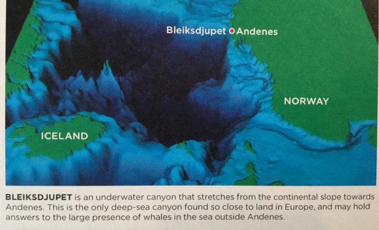 Bei Andenes muss man nicht weit nach Westen aufs offene Meer rausfahren bis man zur Schelfkante gelangt. Dort fällt die Kontinentalplatte rapide ab, das Meer wird schnell sehr tief. Und genau an dieser Kante lebt die Leibspeise der Pottwale: große Tintenfische.