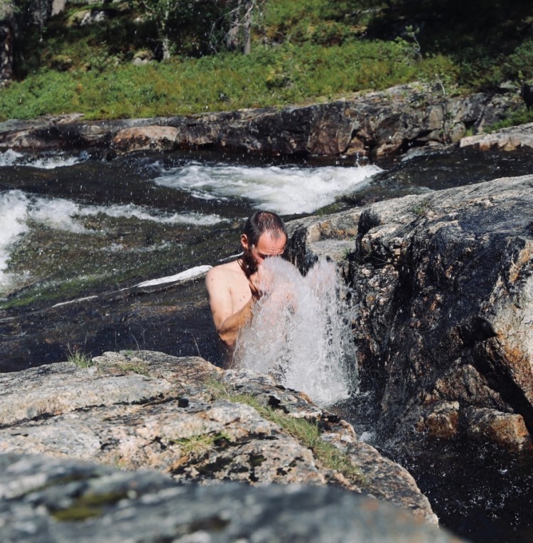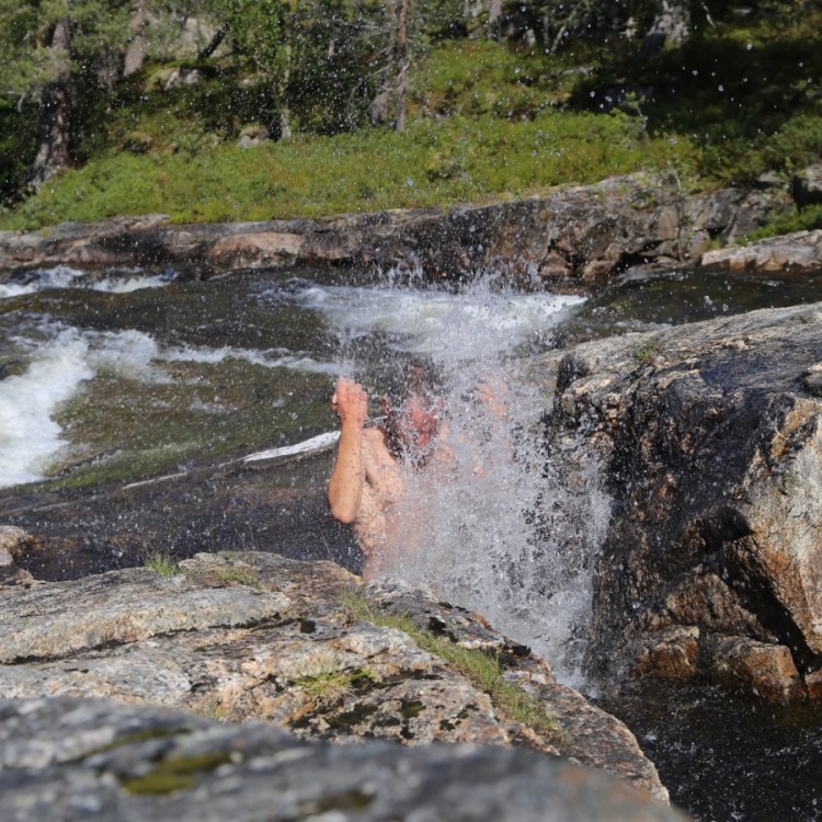 Es folgt ein schöner Wasserfallplatz, der zum Verweilen und Fotografieren einlädt. Und Martin sogar zum Baden. Nur ab und zu verleitet das klare Wasser auch Martina zum Baden. Der schöne Schein ist nämlich ganz schön kalt.